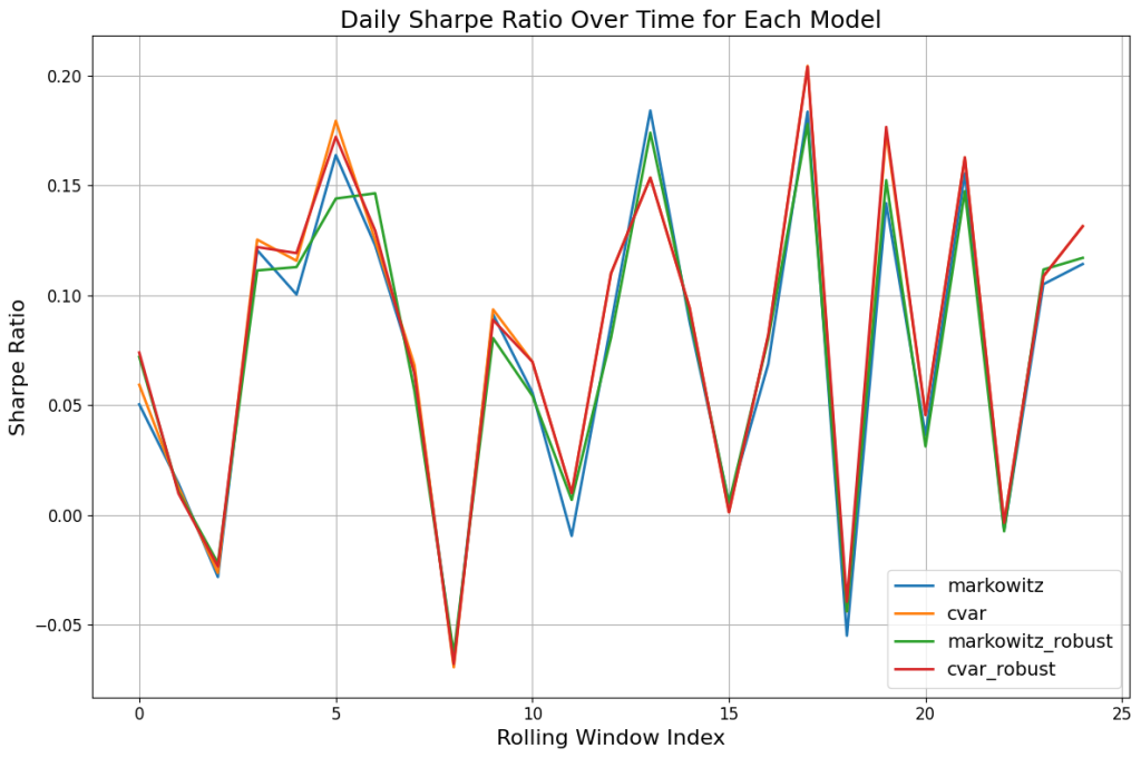 The best of the four models in the scatter plot is the robust CVaR, which has the greatest clustering in the top-left (high-return, low-variance). We are also able to pick up the 2008/2009 financial crash, shown by the four points in the bottom-right of the chart. The risk-return trade-off is similar for the four models as shown in the Sharpe ratio over time, although the CVaR maintains a slight edge over the other models in most time periods.