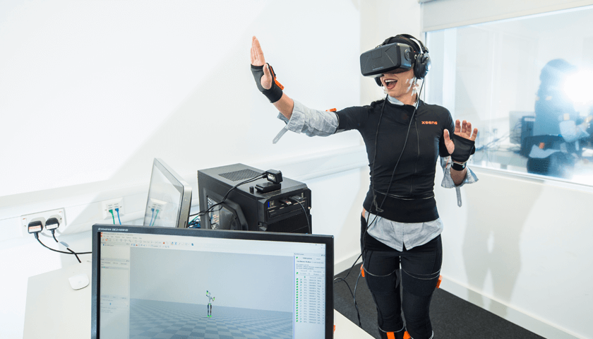 In our Virtual Reality Suite, we explore the influence of the body on space perception in real and virtual environments, spatial memory, and visual processing. Our VR Suite comes equipped with a number of Oculus VR headsets, motion capture suits, and tracker cameras, allowing our test subjects to interact with large VR environments.
