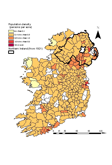 4. The Famine and its Impacts: 1840s-1860sIreland is the only developed country whose population has declined since the early nineteenth century. This decline started with the Great Famine of the late 1840s which was followed by several decades of less spectacular decline or stagnation. The Irish potato crop was first affected by blight in the autumn of 1845. Much of the rural population depended on potatoes for survival and when the crop continued to fail in subsequent years the result was that by 1851 1.1 million people are believed to have died as a direct result of the Famine. PopulationFig 4.1: Population density of Irish baronies in (a) 1821, (b) 1831, (c) 1841, (d) 1851 and (e) 1861. Figure 4.1 shows how Ireland's population density changed from the period from 1821 to 1841, the period of rapid growth described in the previous chapter, and then over the Famine period from 1841-1861. Fig 4.2: Percentage population growth by barony between 1841 and 1861. Sources: 1841 and 1861 Population censuses. Data have been mapped onto 1841 barony boundaries. Unshaded areas have no data due to boundary changes between these two dates. Figure 4.2 shows population change over the famine years. The maps shows that in addition to coastal areas on the western seaboard, traditionally associated with the famine, many inland baronies, particularly in northern Munster and north Leinster also saw major population losses. The population of Ulster was relatively stable while the two baronies that made up Belfast saw rises of 44 and 63 percent respectively. Other urban areas showed more modest growth or stability. The rapid growth in Offlay East, west of Dublin in County Kildare is likely to be explained by the rapid expansion of the Curragh Camp military base following the 'Young Ireland' rebellion of 1848. ReligionFig 4.3: Ireland's three largest religious denominations in 1861 showing (a) Catholics, (b) Church of Ireland, and (c) Presbyterians. The 1861 census was the first to collect data on religion. It showed that Catholics made up 78 percent of the population. Despite the Famine, the geographies that it shows are broadly consistent with those from 1834 shown in chapter 3. Comparing these maps with the map of population change over the Famine period also shows that it was areas with large Catholic populations that experienced the largest loss of population. The fact that the Fa mine disproportionately impacted on Catholic areas, or perhaps more accurately, that Catholics were over-represented in the poorest areas which, in turn, were hardest hit by the Famine, served to reinforce sectarian divisions in the post-Famine era. Social impactsFig 4.7: Illiteracy in English by barony, (a) 1841, (b) 1851 and (c) 1861. Figure 4.7 shows how the percentage of each barony's population who could not read or write in English, and were thus classed as illiterate, changed over the Famine period. In 1841 illiteracy was heavily concentrated on the western seaboard, with baronies with rates of over 80 percent or more covering all of Connemara in western County Galway and areas of Mayo, south Kerry and the Ring district in County Waterford. The extent of these high rates contracts significantly over the Famine period. The areas with the lowest levels of illiteracy, below 20 percent are chiefly found around Belfast. It must be noted that these patterns are not so much a reflection of differing levels of education, although there were many with religio-political agendas who claimed that they were, but rather of the persistence of Gaelic in western parts of Ireland. This had not been widely used in north-east Ulster for over two centuries. Fig 4.8: Fourth class housing as a percentage of dwellings per barony, (a) 1841, (b) 1851 and (c) 1861. Figure 4.8 shows the percentage of housing defined by the census as fourth class. This was the lowest calibre of housing as defined by the census as consisting of 'mud cabins having only one room.' In 1841 these were overwhelmingly concentrated in the western half of the island. The subsequent two maps indicate a remarkable decline in the poorest quality of housing over the ensuing two decades. By 1861 only the entire county of Kerry and isolated parts of western Cork, Galway and Mayo showed concentrations of poor quality housing of over 20 percent. The reason why illiteracy in English declined and housing quality improved was because an entire class of people, including the landless, cottiers and small farmers, disappeared from the Irish landscape between 1841 and 1861. Economic impactsIn economic terms the Famine was more remarkable for its continuities than its disruptions. This can in part be explained by its spatial and social impact as it disproportionately affected the west of the country and the poorest tier of the population. Fig 4.9: Percentage of farms of 15 acres or less by barony (a) 1852, (b) 1861 and (c) 1871. Figure 4.9 shows the percentage of small farms, those that are 15 acres or less from 1852 to 1871. Over the period the pattern remains relatively stable, the areas with the highest proportions are in eastern Connacht, the north midlands and south Ulster. The south Ulster concentration can be explained by the high population densities in this region and the growing of flax for the linen mills of the Lagan valley. In eastern Connacht and the north midlands it can be explained by the heavy population loss during the Famine leading to a consolidation of smallholdings. Thus, entrepreneurship was spreading into Irish agriculture as the subsistence system was swept away. Real power, however, still remained with the landlords rather than the farmers and they responded to the collapse in incomes caused by the Famine by evictions, creating a legacy of bitterness that would last generations. Even this was not sufficient to save many estates who went bankrupt. This did not lead to the estates being broken up but did put land reform on the political agenda for much of the later 