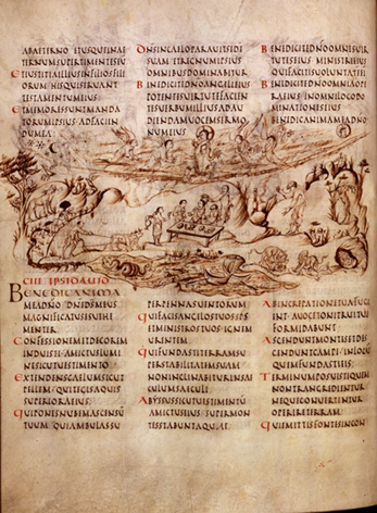 The Utrecht Psalter was written in Reims c.820. It is remarkable for the lively drawings which illustrate the themes of each psalm. It was at Canterbury some time in the early 11th century, when it was copied by the monks of Christ Church, who updated the script to the fashionable Carolingian Minuscule, and coloured their drawings rather than leaving them monochrome, as here. The Utrecht Psalter is a high-status liturgical book written in Roman Rustic with Artificial Uncial as a display script.