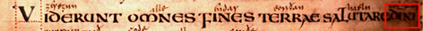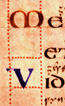 the capital letters of the opening word of each verse of the psalm. These are of a different size and colour to the body of the text, and are separated from it visually both by a gap, and by being enclosed in a grid pattern of red dots which follows the baselines of the text. Attention is thus drawn to the layout of the script. |
