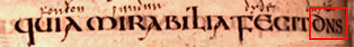 T, have been run together to save space at the end of a line. In spite of this, the line has still overrun, and the scribe has tucked the last two words into the bottom margin on the right. |