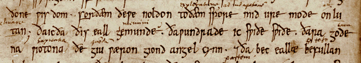 | ðone wis dom. Forðæm ðewe noldon toðæm spore mid ure mode ón lu tan ; ðaicða ðis eall gemunde . ðawundrade ic swiðe swiðe . ðara gode na wiotona. ðe giu wæron giond angel cynn . ond ða bec eallæ befullan |