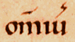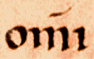 ![]() | The horizontal line over a letter shows that an m or n has been missed out. This frequently happens in the word omnis, 'all', which is reduced to an om followed by the appropriate grammatical ending. This is omni (section 3, line 5). | ![]() |