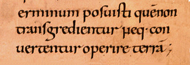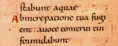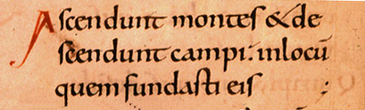 .......stabunt aquae. A ...b increpatione tua fugi- .......ent : a uoce tonitrui tui .......formidabunt. A....scendunt montes et de- .......scendunt campi in locum .......quem fundasti eis. [T].erminum posuisti quem non .......transgredientur neque con- .......uertentur operire terram. |