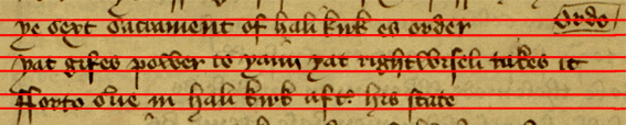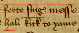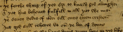This is a book of religious instruction for private use, and thus less formal than the York Register, which is a civic document. The hand is clear and well-formed, but definitely cursive in quality, and has the familiar ‘pointed’ look of Secretary, though its overall uprightness and some of its letter-forms are intended to suggest its function as a bookhand.