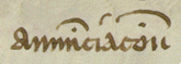 This is the sign indicating that an n or m has been left out. This scribe arches it, and adds a dot underneath the arch. It appears here in the word annunciatioun, 'Annunciation'. | ![]() |