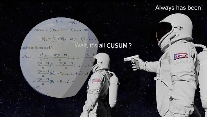 Which is essentially minus the LR test as we saw last week, without the null component. Specifically, for one change, minimizing the segmentation cost over all possible changepoints locations \(\tau\) is equivalent to maximizing the CUSUM statistic.